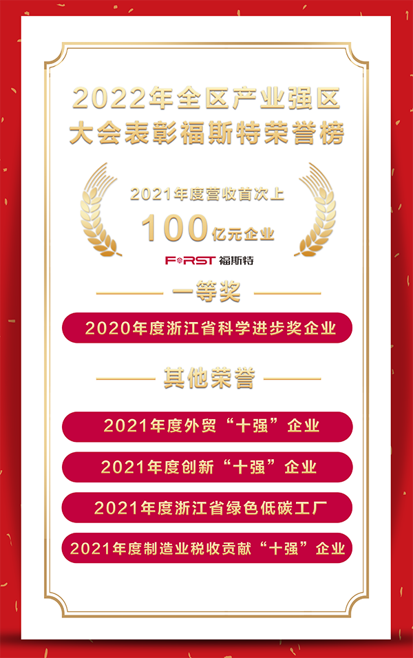 2022年3月21日上午,2021年度臨安全區(qū)產業(yè)強區(qū)大會隆重召開,福斯特榮獲2021年度臨安區(qū)首次營收上“百億企業(yè)”、“制造業(yè)稅收貢獻十強企業(yè)”、“外貿十強企業(yè)”、“創(chuàng)新十強企業(yè)”等四項榮譽。此外,福斯特獲2021年度浙江省綠色低碳工廠、2020年度浙江省科學技術進步一等獎受到大會表彰。董事長林建華代表公司參加頒獎儀式,并作主題交流發(fā)言。
